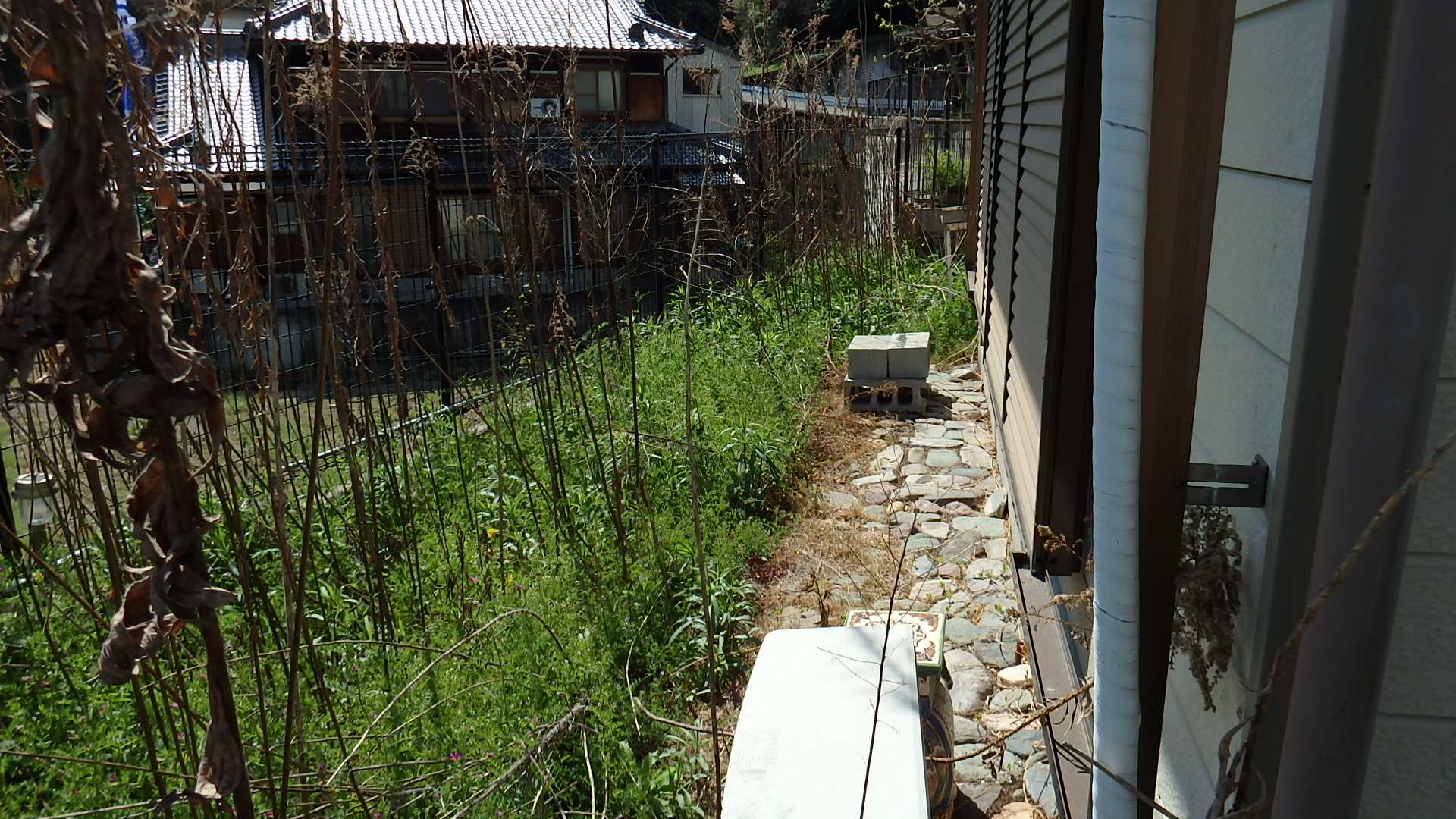 和歌山市西小二里にある空き家になっているご実家の庭が気になっていたお客様から、草刈りと草引きのご依頼をいただきました。1名で約3時間の作業で、裏庭と側面の細長い庭に広がっていた枯れ草や雑草をすべて取り除き、地面が見えるスッキリとした状態に整えた事例をご紹介します