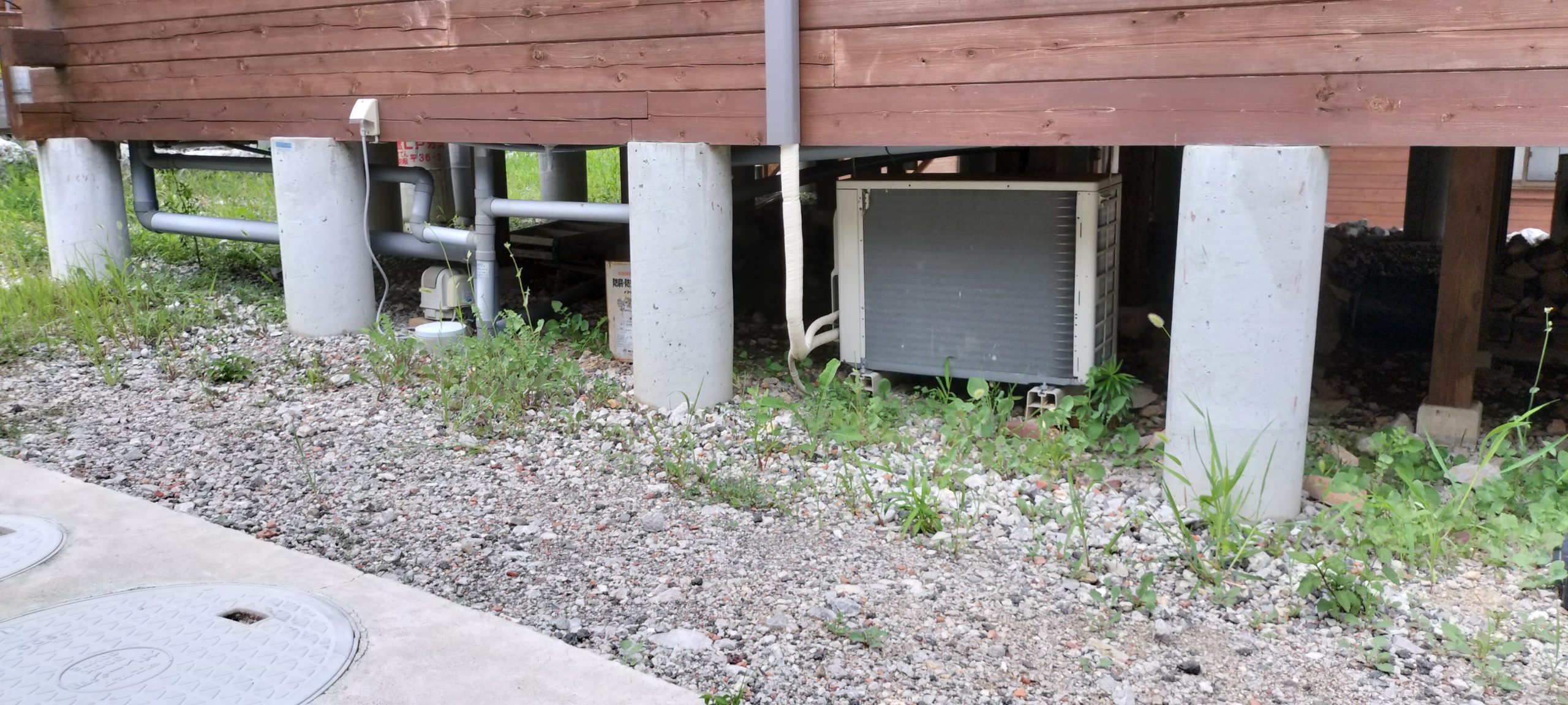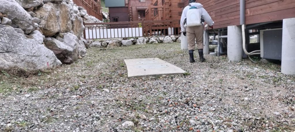 草刈り後、そのままにしておくとすぐに雑草が再び生えてきます😣 そこで、除草剤を噴霧器でまんべんなく散布 し、長期間の雑草抑制を行いました!